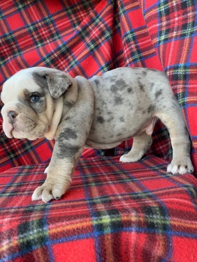 Щенок цветного английского бульдога, мальчик. Окрас бело-лиловый мерль. Документы АВKC. Привит по возрасту. Озорной, чудесный мальчик ищет своих маму и папу.